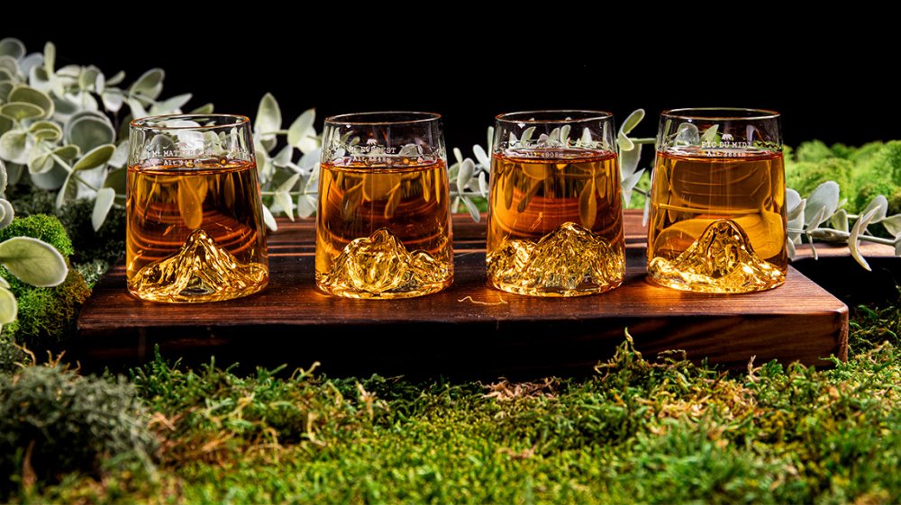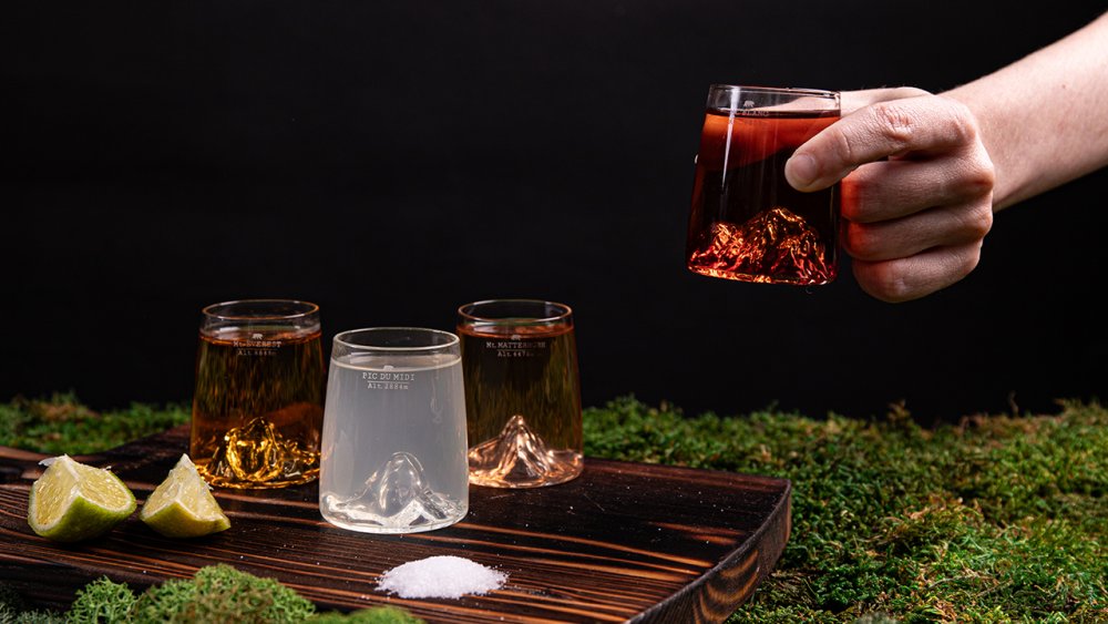 Hlavním designovým prvkem jsou reliéfy na dně sklenic, které představují vrcholky hor Mount Everest, Mont Blanc, Matterhorn a Pic di Midi. Tato jedinečná topografická úprava byla vytvořena s použitím 3D tiskárny a následně detailně ručně dozdobena. Snaha o autenticitu a individualitu dává každé sklenici charakter a osobitost.